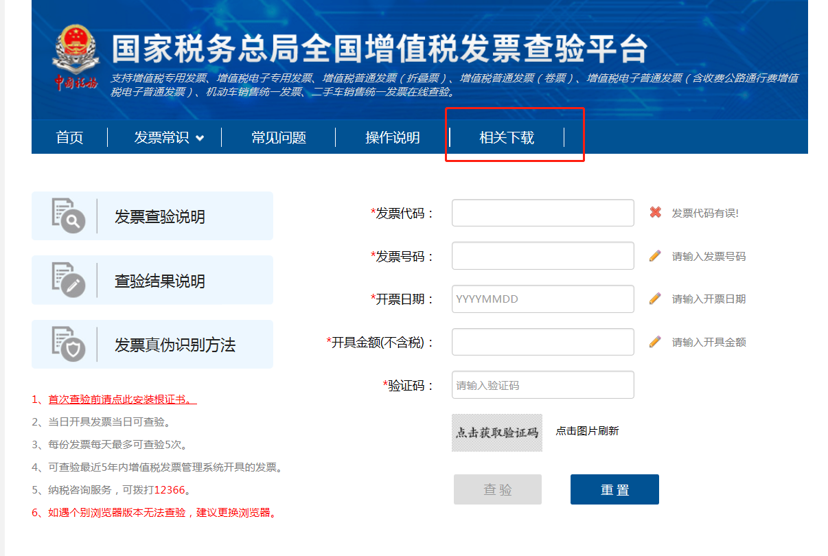 特別提示:單位和個(gè)人通過(guò)網(wǎng)頁(yè)瀏覽器首次登陸平臺(tái)時(shí),應(yīng)根據(jù)提示下載安裝根證書文件,并仔細(xì)查看查驗(yàn)平臺(tái)提供的發(fā)票查驗(yàn)操作說(shuō)明。