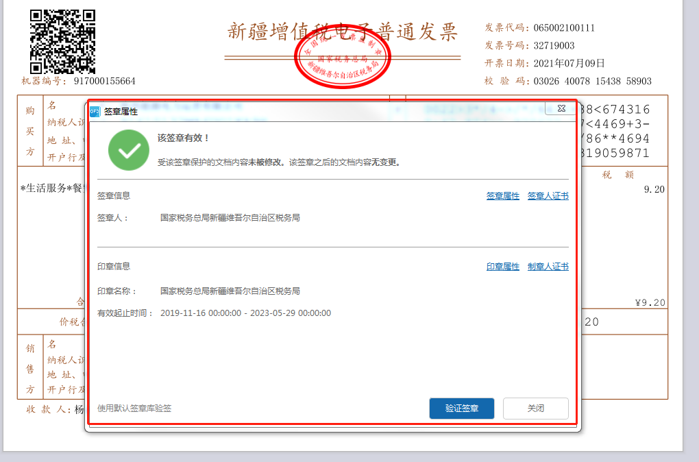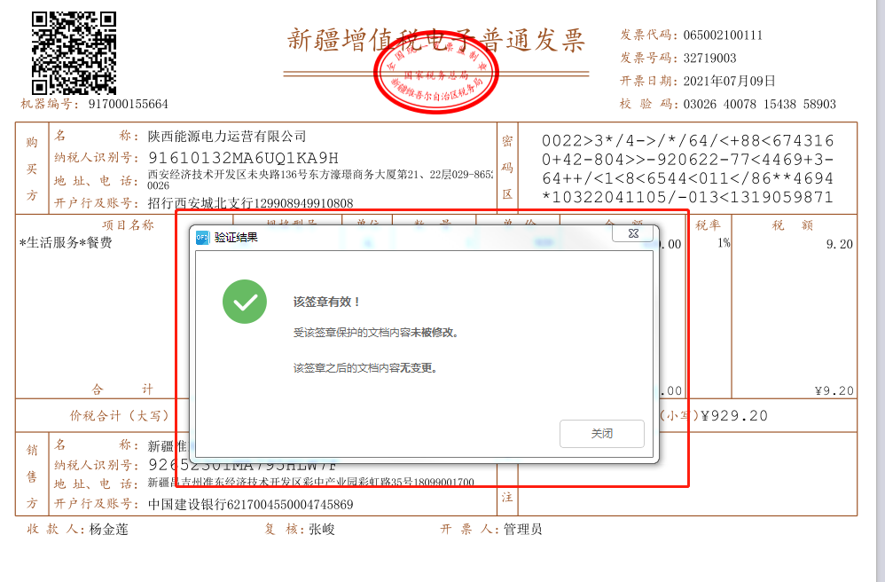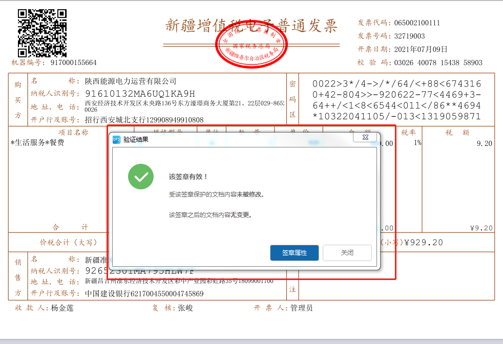 如果銷方簽名有效,顯示驗(yàn)證結(jié)果為“該簽章有效!自應(yīng)用本簽章以來(lái),文檔內(nèi)容未被修改”。