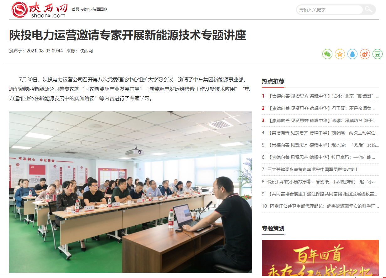 7月30日,公司召開(kāi)第八次黨委理論中心組擴(kuò)大學(xué)習(xí)會(huì)議,邀請(qǐng)了中車(chē)集團(tuán)新能源事業(yè)部、原華能陜西新能源公司等專家就“國(guó)家新能源產(chǎn)業(yè)發(fā)展前景”“新能源電站運(yùn)維檢修工作及新技術(shù)應(yīng)用”“電力運(yùn)維業(yè)務(wù)在新能源發(fā)展中的實(shí)施路徑”等內(nèi)容進(jìn)行了專題學(xué)習(xí)。