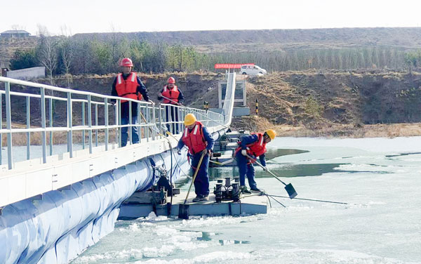 受氣溫回升影響,趙石畔煤電水源地王圪堵水庫冰面融化加速,大塊浮冰撞擊輸水管線浮箱,對(duì)取水泵船和輸水管線造成威脅。趙石畔項(xiàng)目部第一時(shí)間抽調(diào)人員組織清理疏通冰凌,經(jīng)過9小時(shí)不懈努力,上游約2500平米的冰塊全部破碎,徹底疏通輸水管線,有效保證了取水泵船的安全。