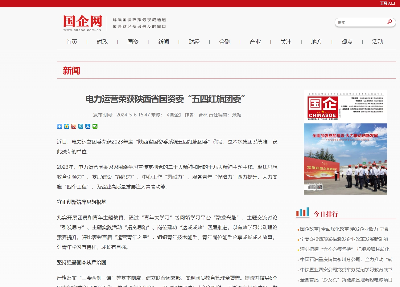 近日,電力運(yùn)營(yíng)團(tuán)委榮獲2023年度“陜西省國(guó)資委系統(tǒng)五四紅旗團(tuán)委”稱號(hào),是本次集團(tuán)系統(tǒng)唯一獲此殊榮的單位。