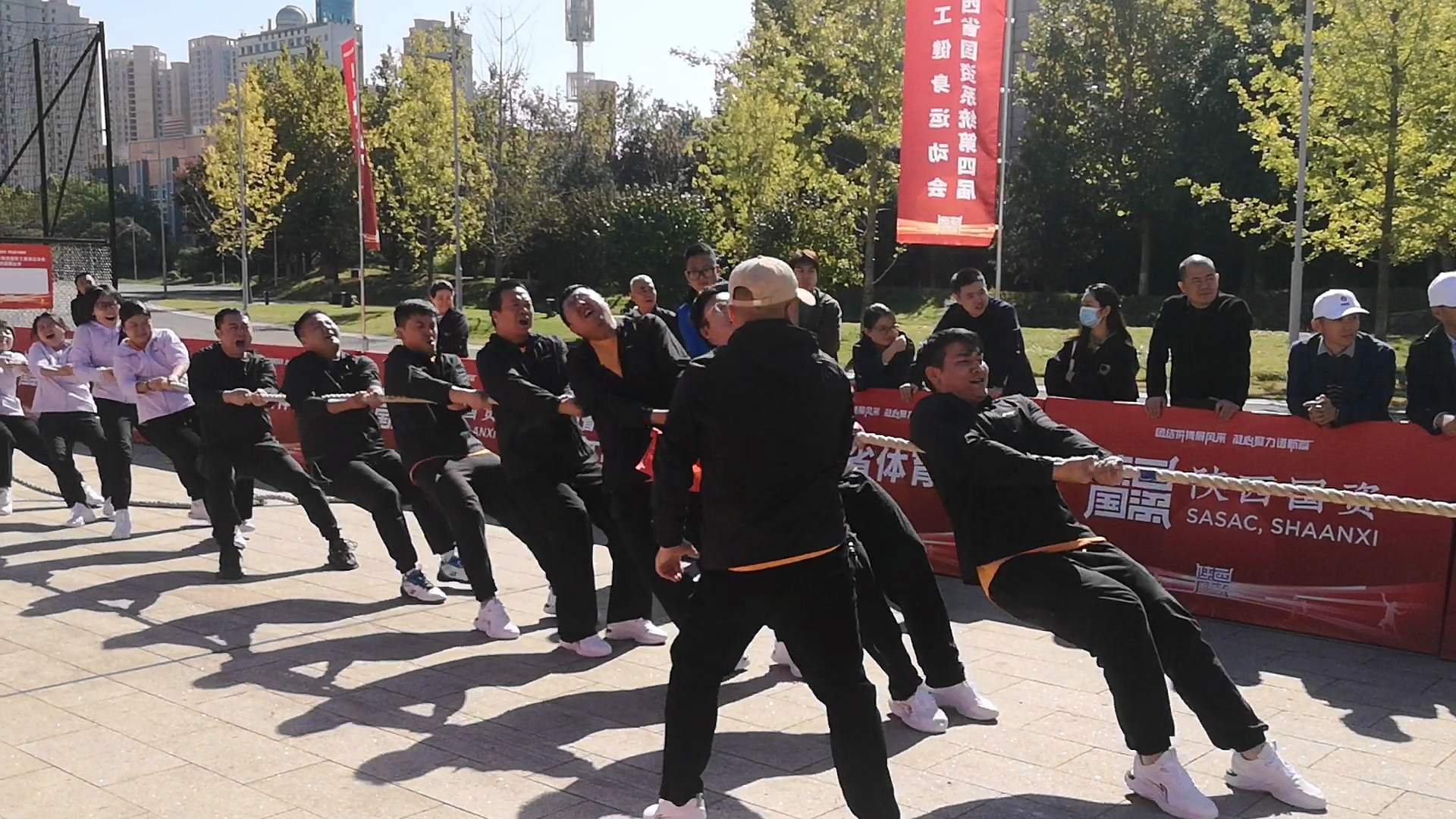 “放低,壓住,用腿發(fā)力!”拉!”……隨著裁判一聲哨響,參賽選手跟隨指揮的號(hào)令聲齊聲呼喊,聲音洪亮如鐘,步伐堅(jiān)定整齊,傾全力于一身、集合力于一繩。經(jīng)過(guò)幾輪焦灼的拉鋸戰(zhàn),代表隊(duì)最終戰(zhàn)勝陜西電子代表隊(duì),勇奪第七名。