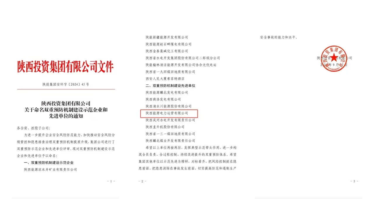 近日,公司榮獲陜投集團(tuán)“雙重預(yù)防機(jī)制建設(shè)先進(jìn)單位”稱號。
