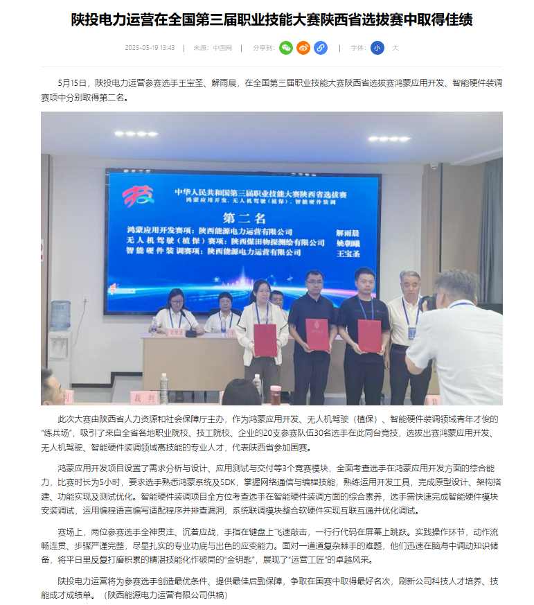5月15日,陜投電力運(yùn)營(yíng)參賽選手王寶圣、解雨晨,在全國(guó)第三屆職業(yè)技能大賽陜西省選拔賽鴻蒙應(yīng)用開發(fā)、智能硬件裝調(diào)賽項(xiàng)中分別取得第二名。