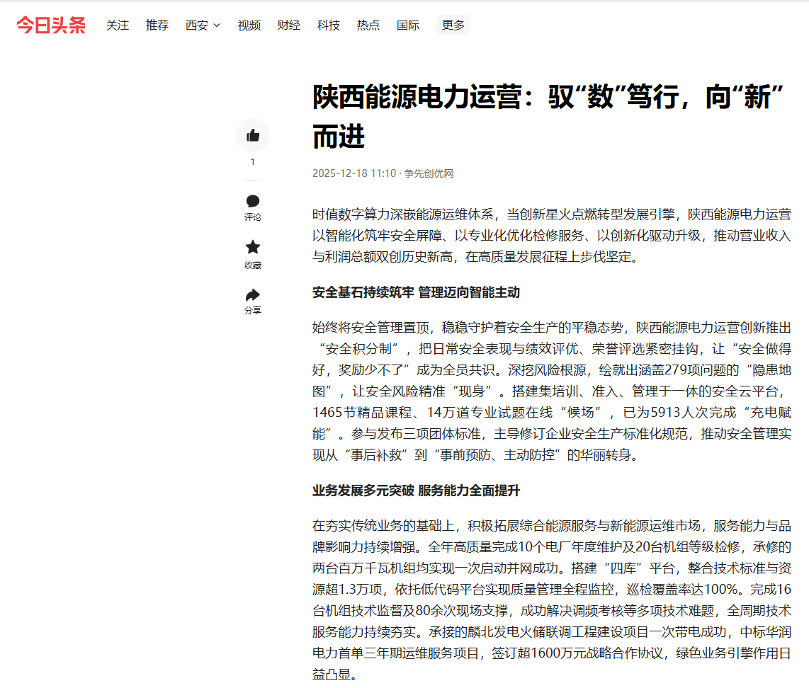時值數(shù)字算力深嵌能源運維體系,當創(chuàng)新星火點燃轉(zhuǎn)型發(fā)展引擎,陜西能源電力運營以智能化筑牢安全屏障、以專業(yè)化優(yōu)化檢修服務(wù)、以創(chuàng)新化驅(qū)動升級,推動營業(yè)收入與利潤總額雙創(chuàng)歷史新高,在高質(zhì)量發(fā)展征程上步伐堅定。