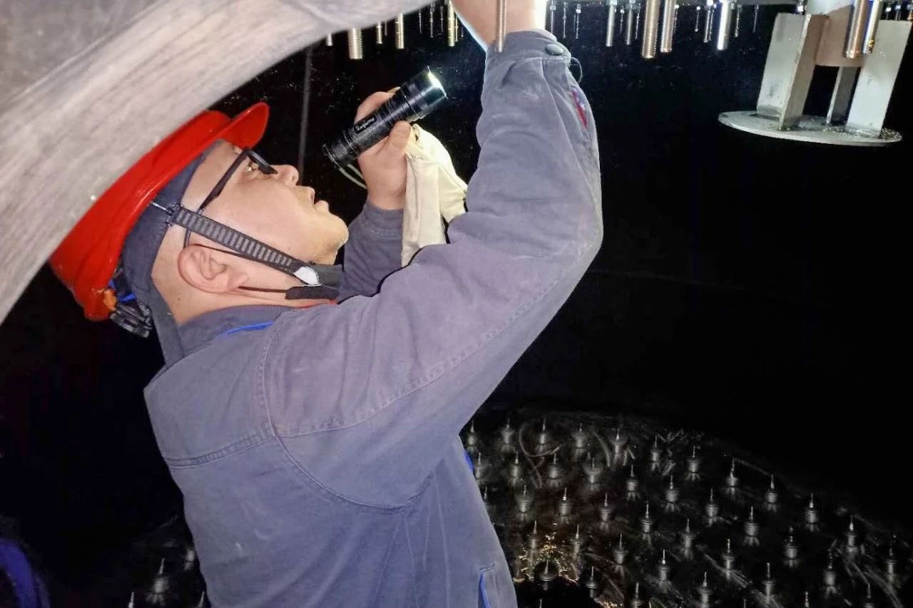 3月13日,渭河項(xiàng)目部機(jī)務(wù)隊(duì)主機(jī)班詹涇永在檢查汽輪機(jī)葉片