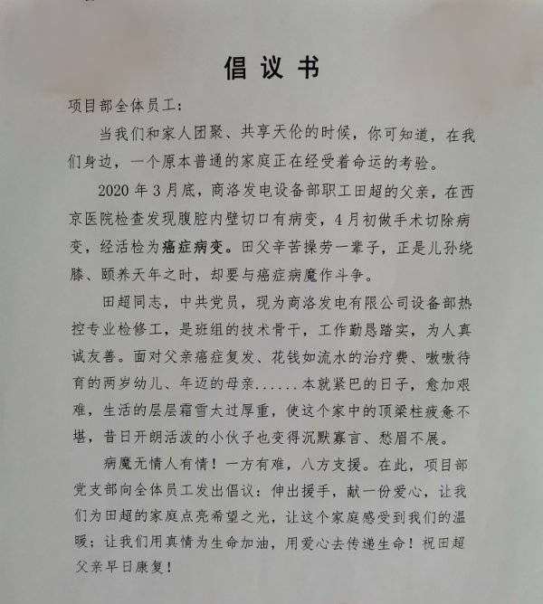 近日,商洛發(fā)電設備部職工田超的父親因患癌癥入院治療。聞知消息后,立即向全體職工發(fā)出捐款倡議,大家伸出援助之手,紛紛慷慨解囊,積極踴躍捐款,以實際行動表達電力運營對兄弟單位員工的關愛。